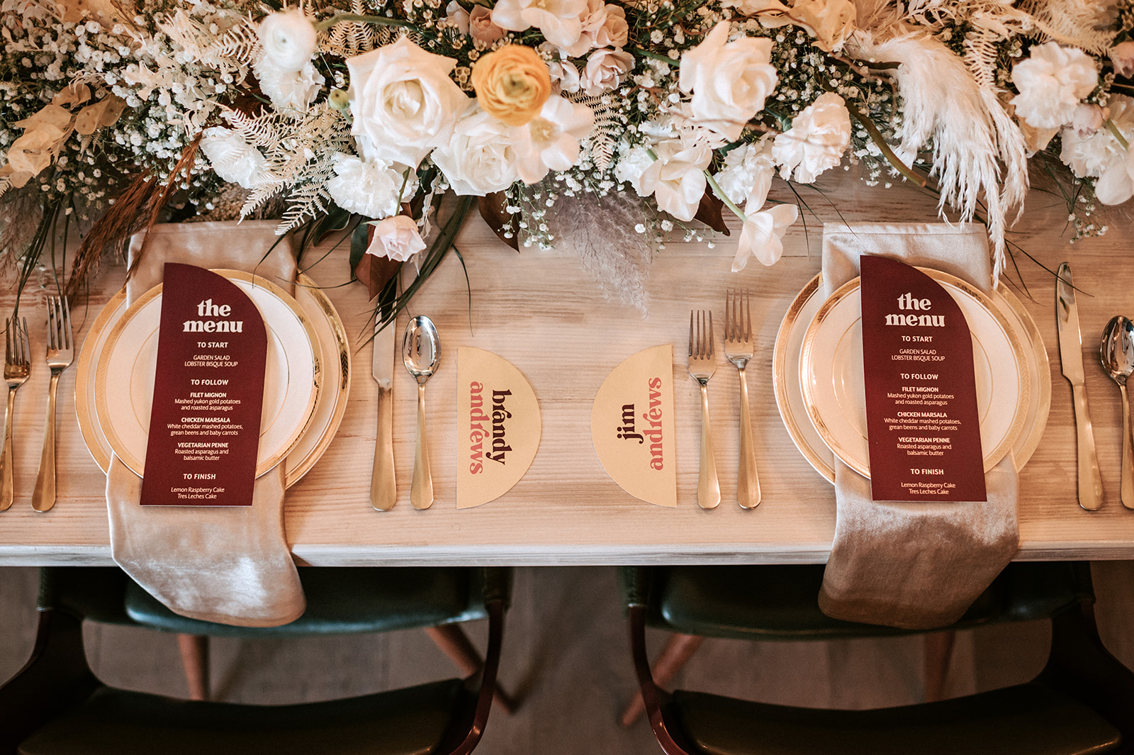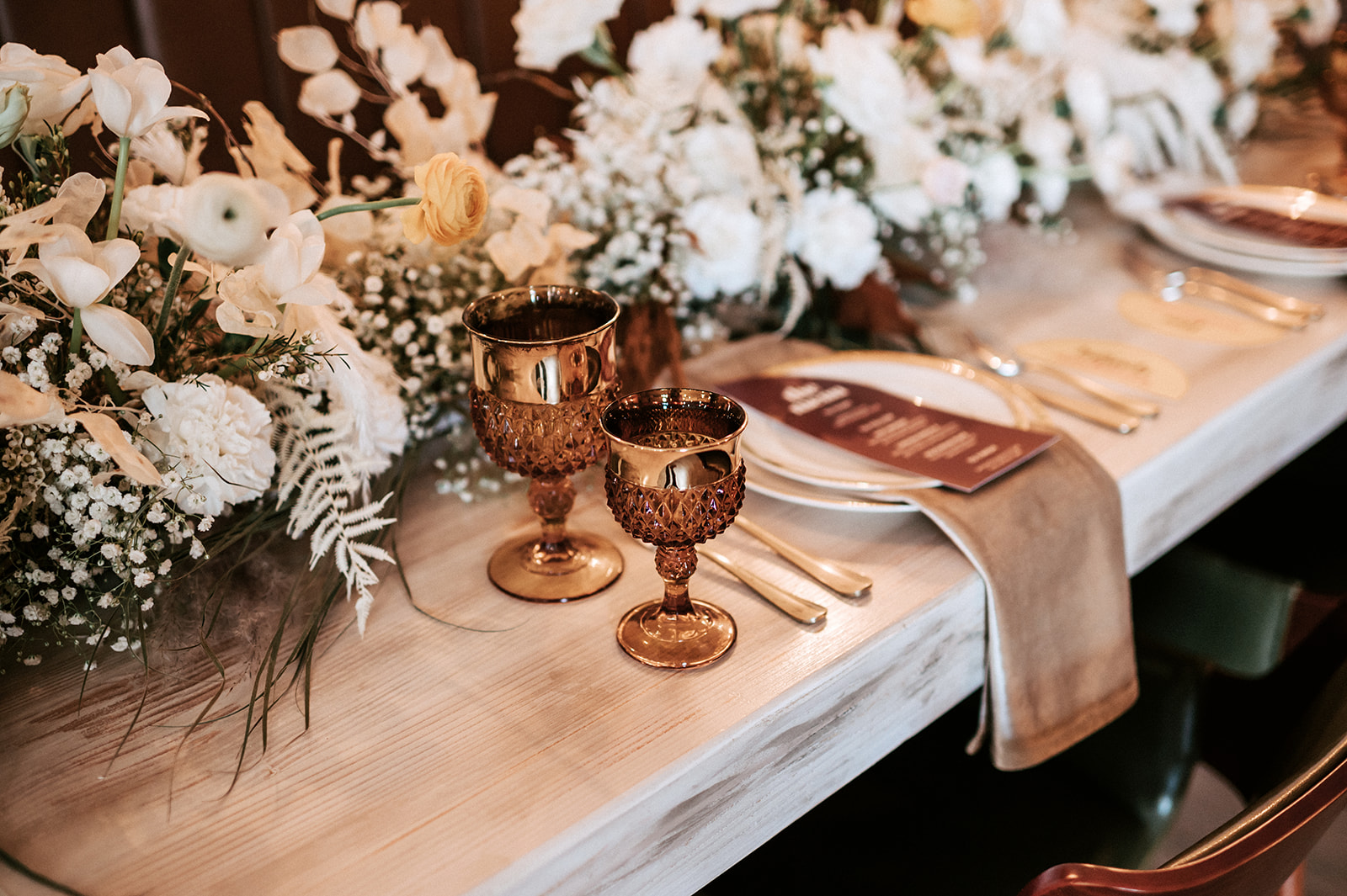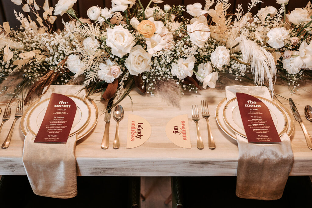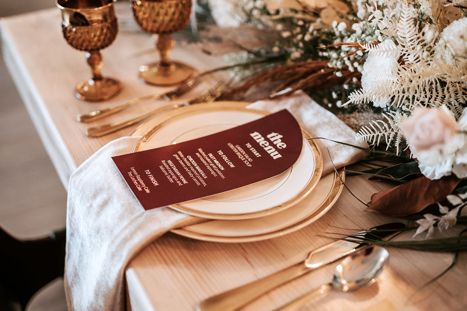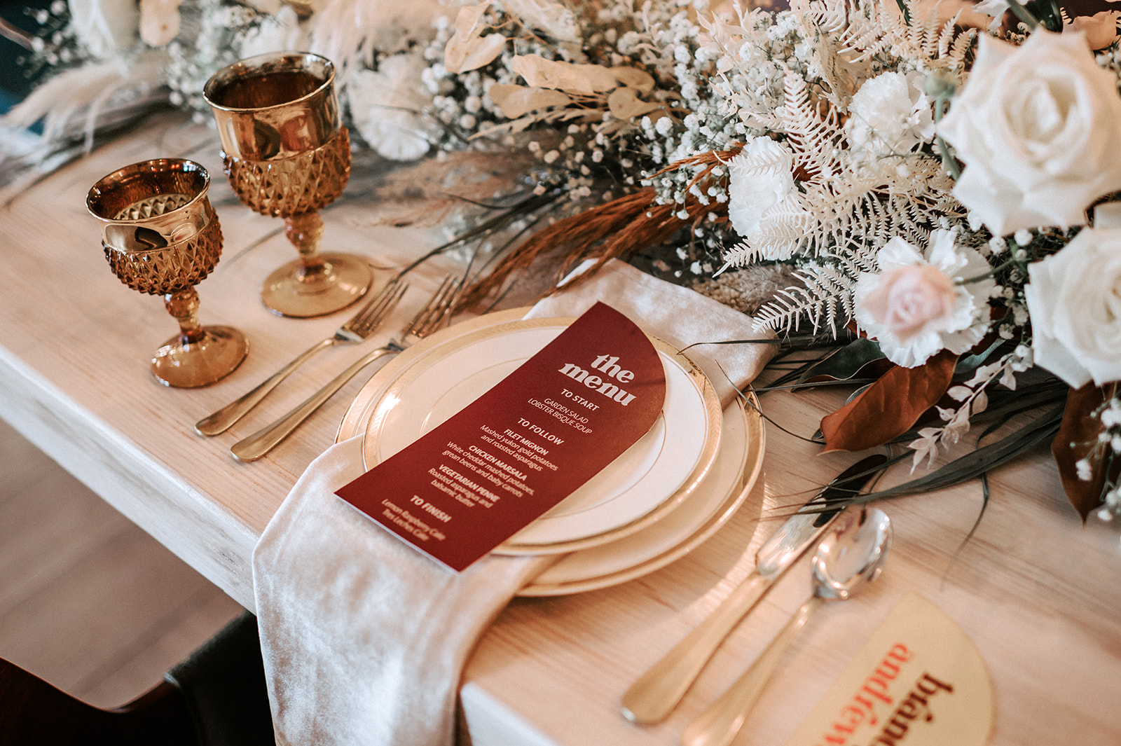 The warm colour palette for this intimate wedding shoot was juxtaposed by the stunning monochromatic floral arrangement that donned the length of the sweetheart table. Vintage gold rimmed glasses and dinnerware, along with a bold wine coloured menu, were complimented by champagne velvet napkins.