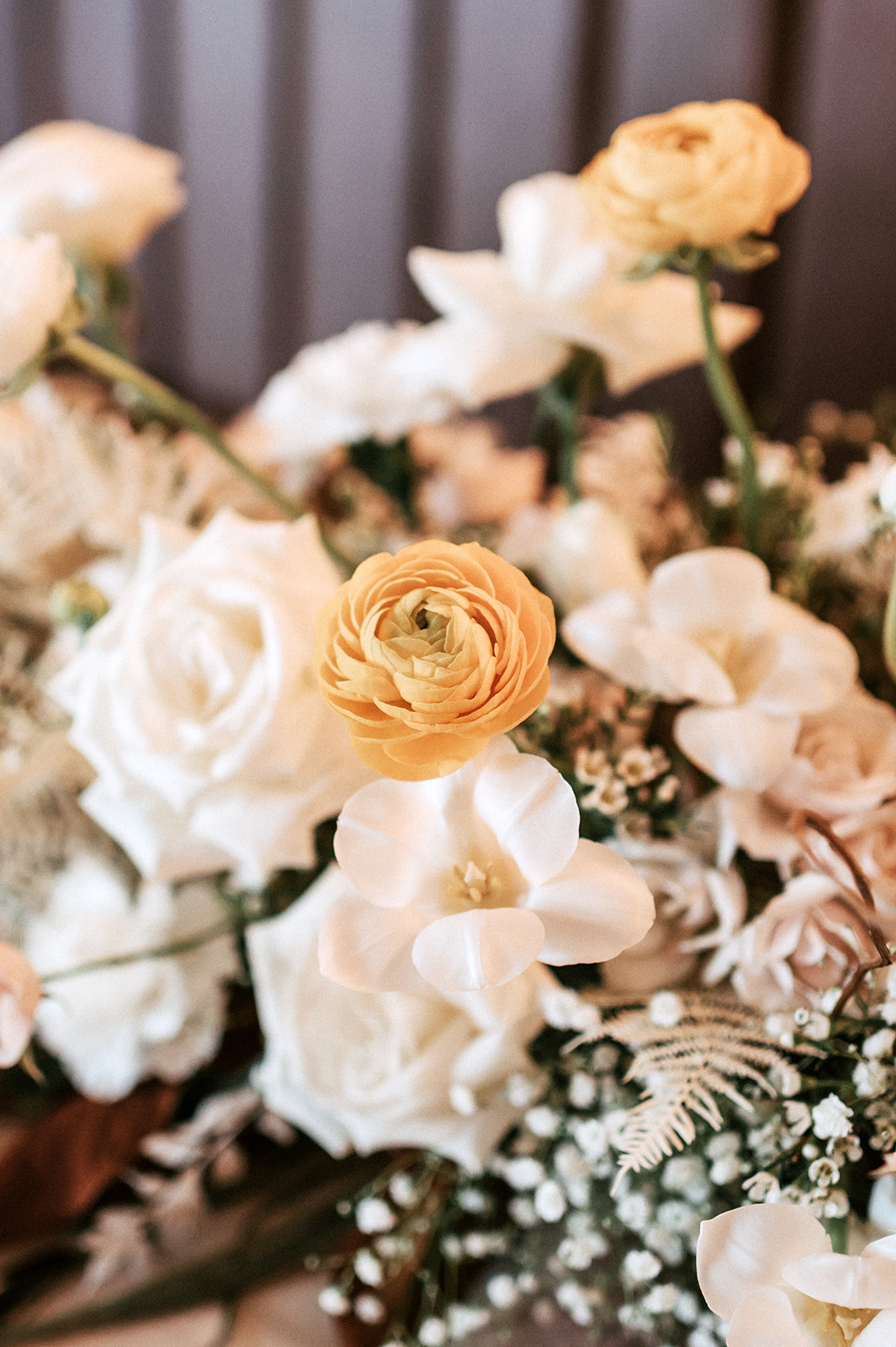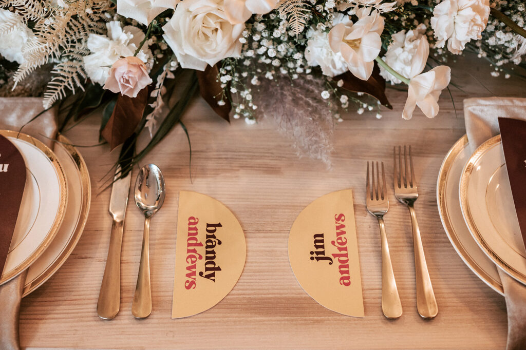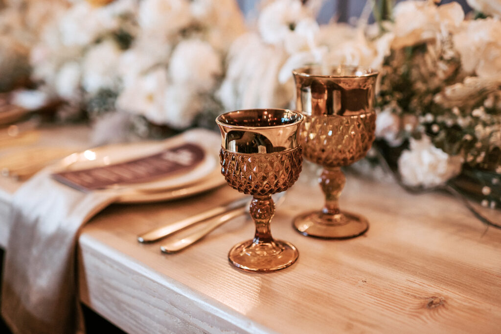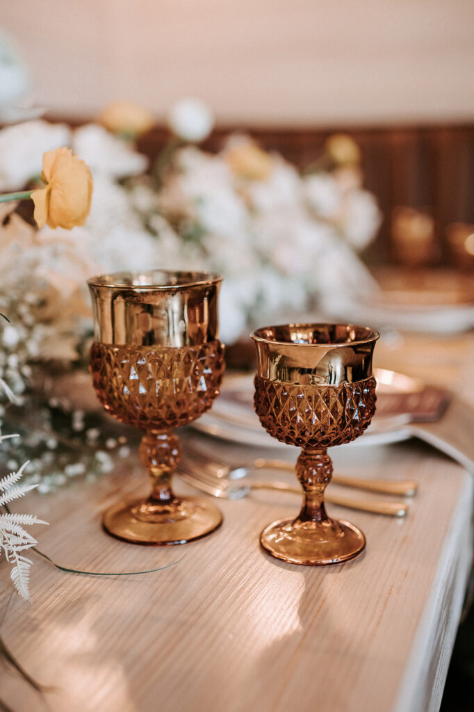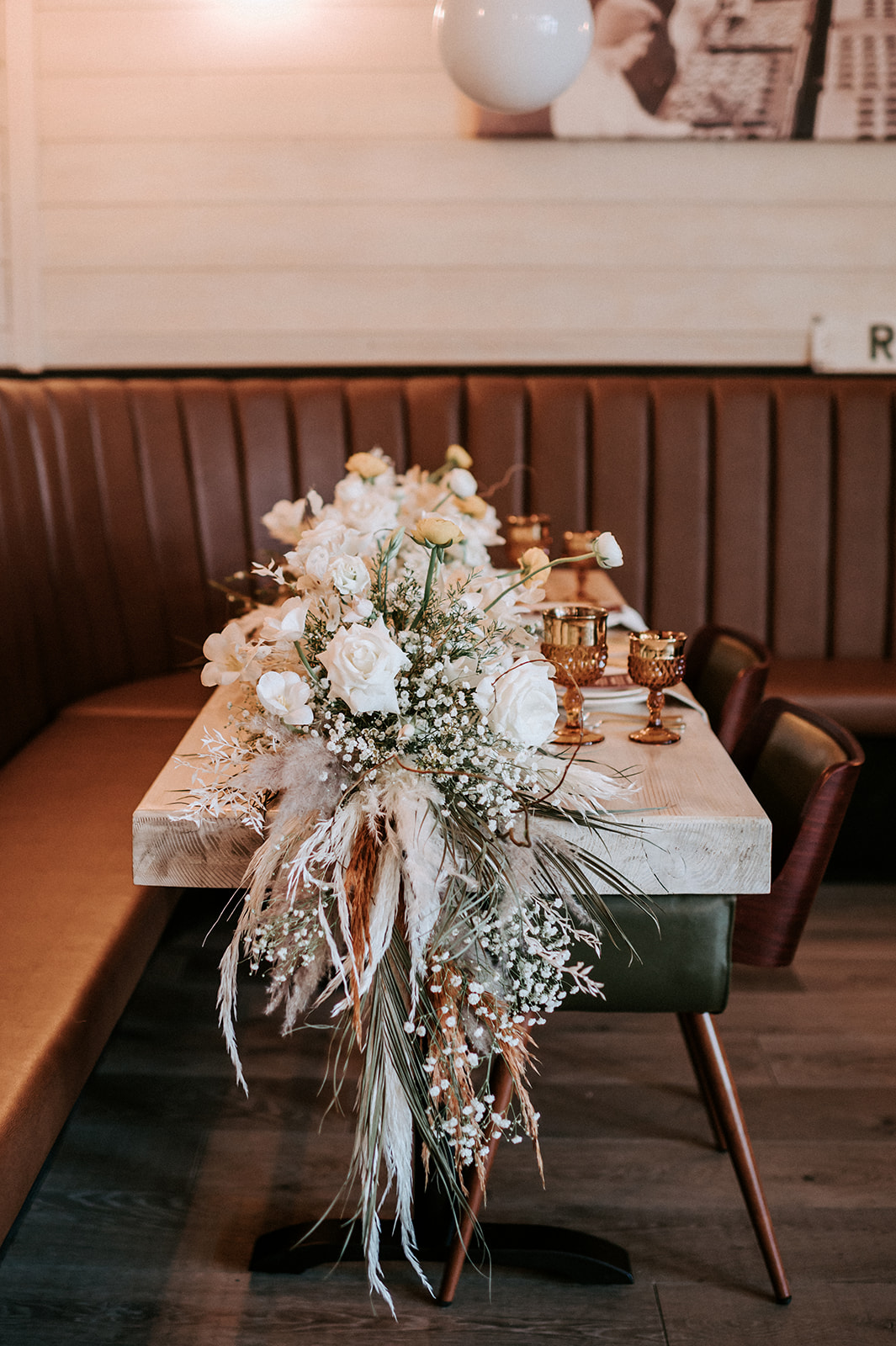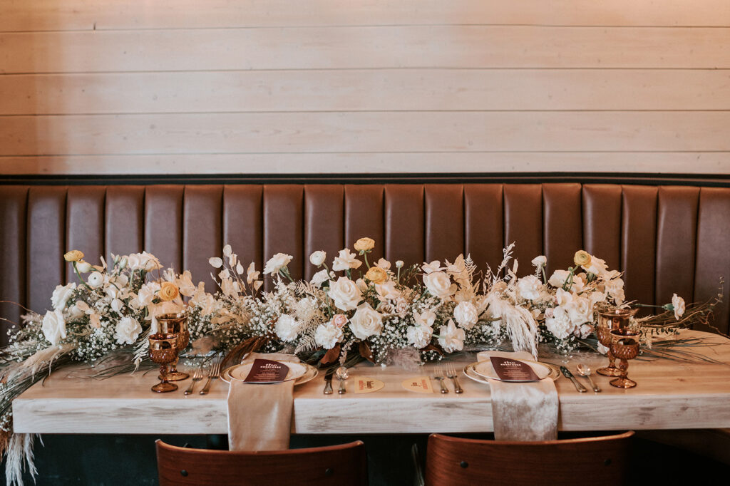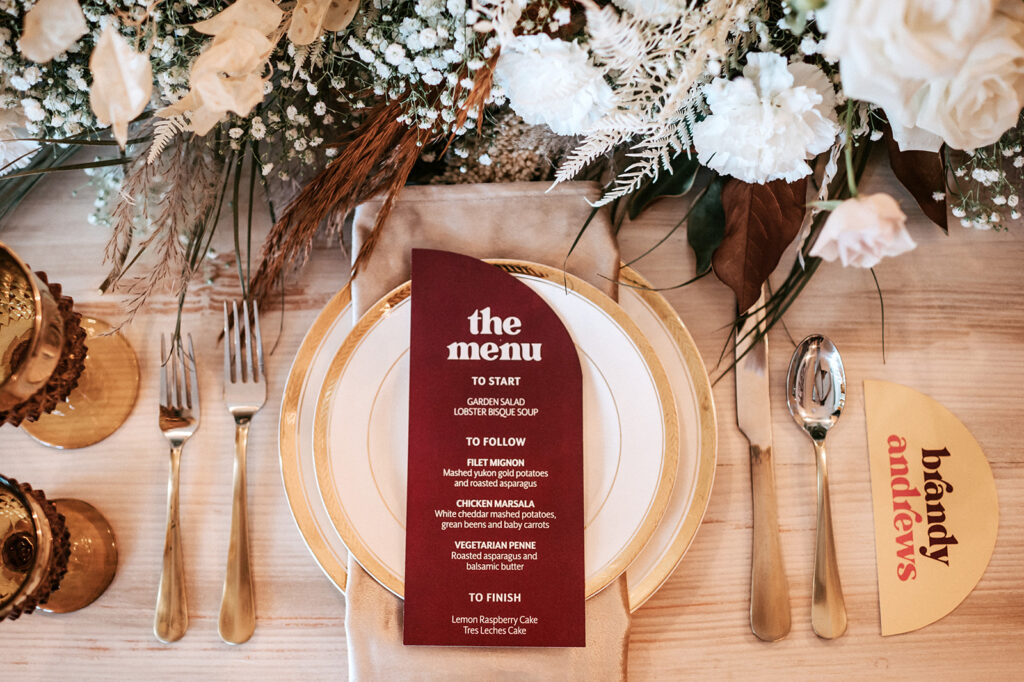 The warm colour palette for this intimate wedding shoot was juxtaposed by the stunning monochromatic floral arrangement that donned the length of the sweetheart table. Vintage gold rimmed glasses and dinnerware, along with a bold wine coloured menu, were complimented by champagne velvet napkins.