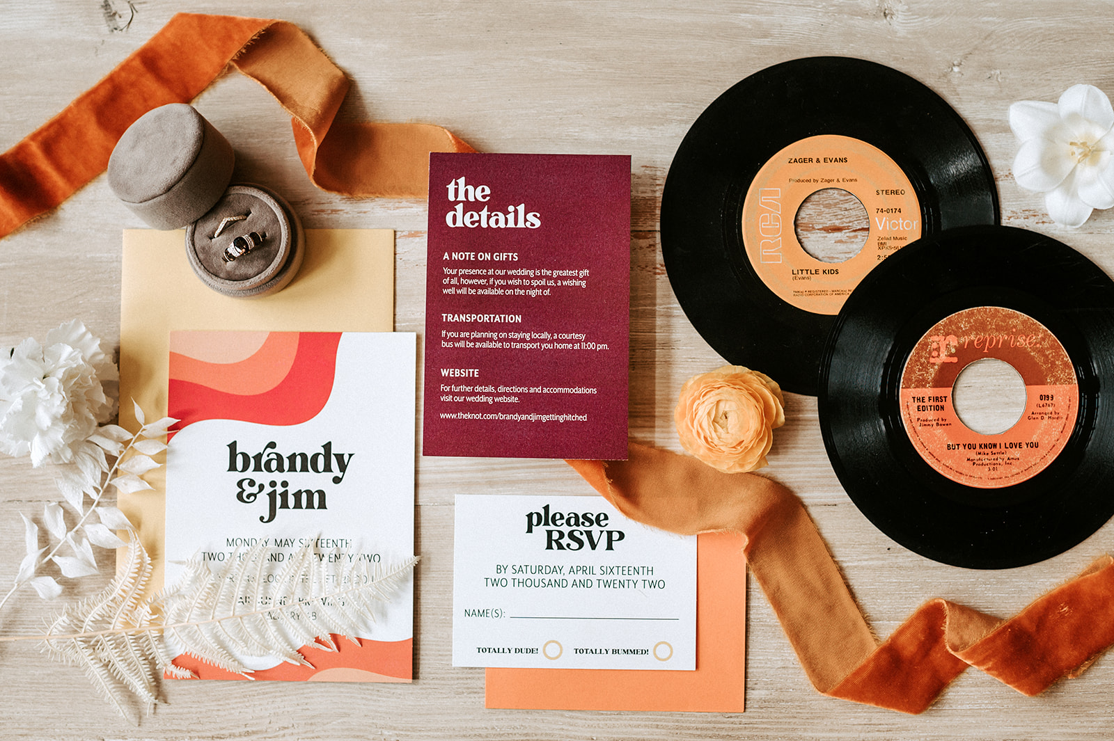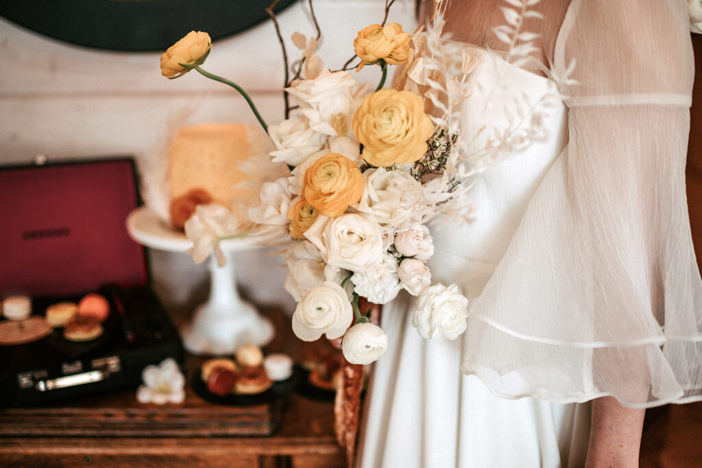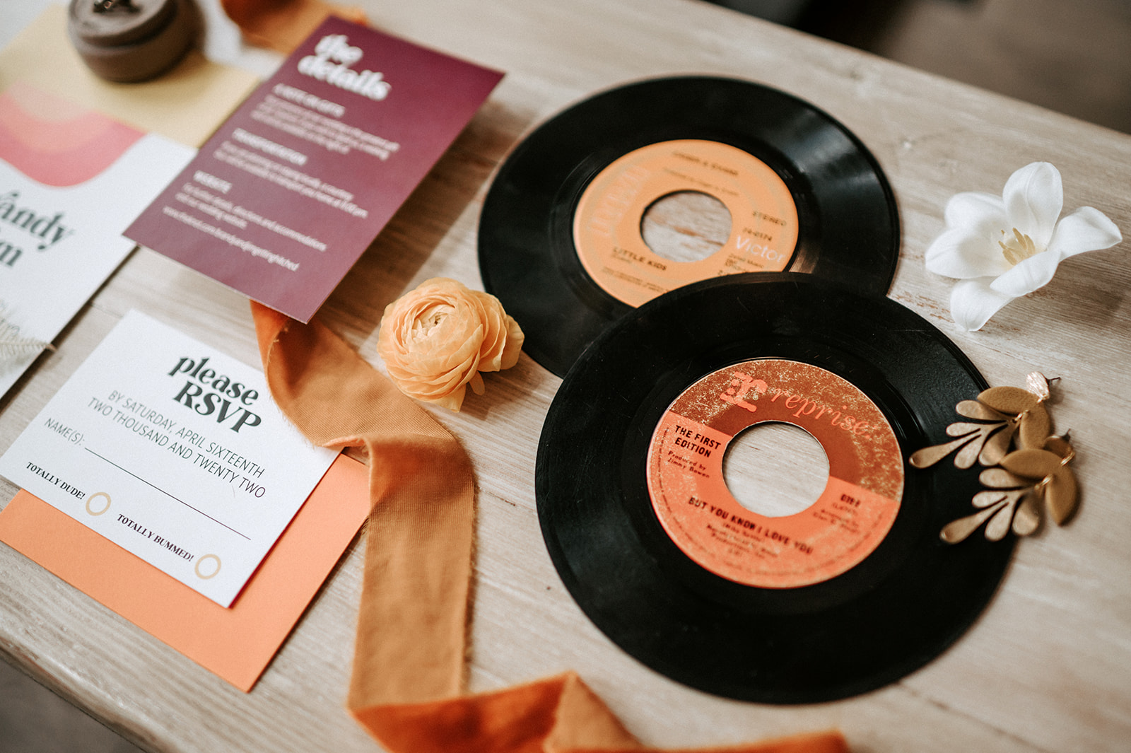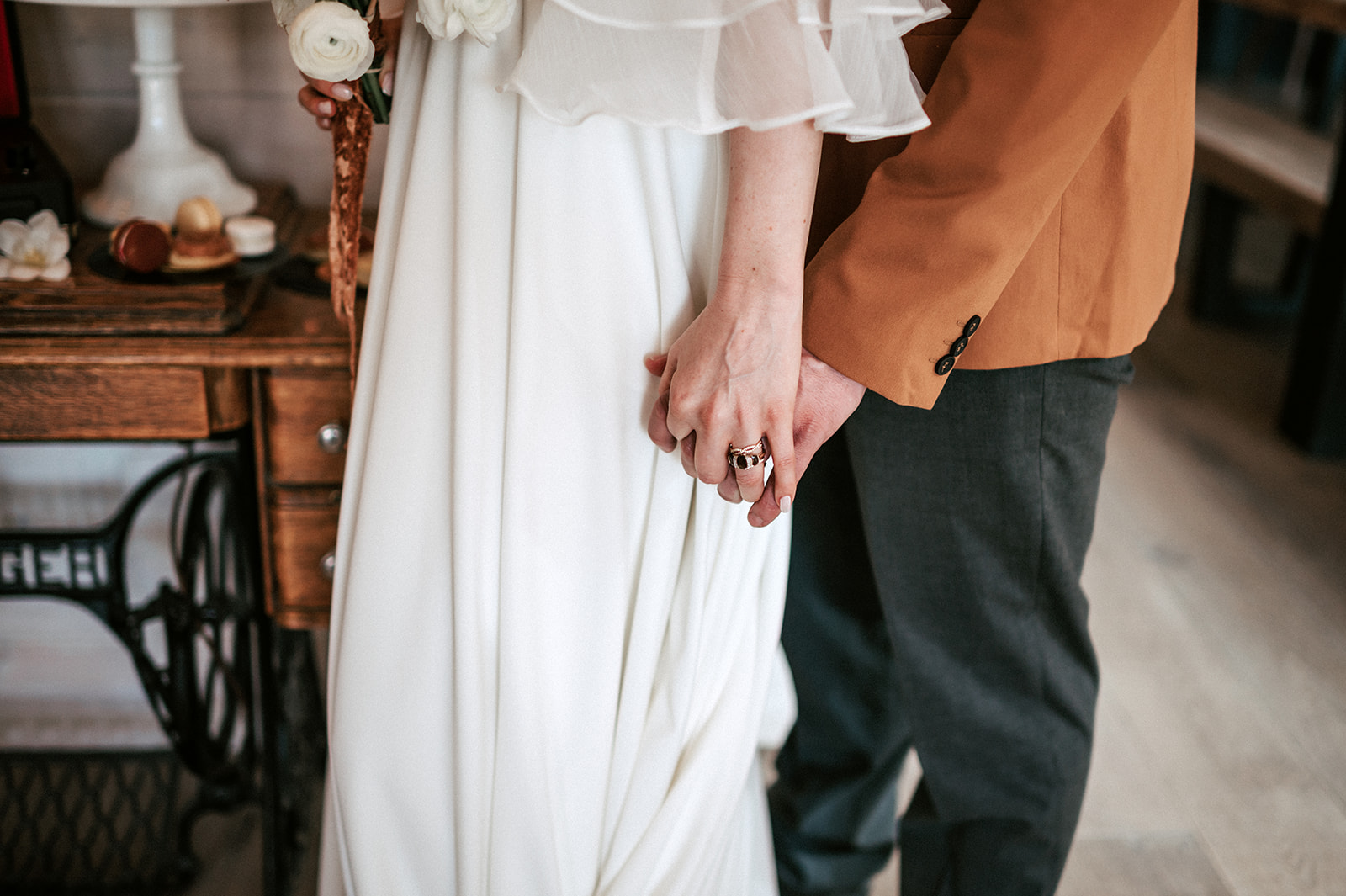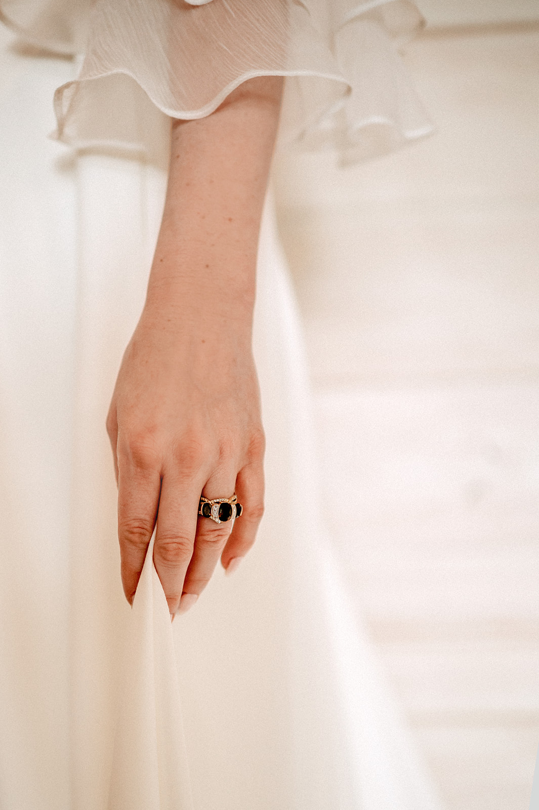 With it’s off-white crepe tiered bell sleeves and high neckline, the Sophia gown by Sistene, from Lovenote Bridal, provided just the right amount of 70 vibe. The groom wore a vibrant ochre suit jacket and a funky floral bow tie, while the bride wore clay and gold drop earrings. A triple set of stunning 70’s inspired diamond and quartz rings for our bride, and an intricate white and yellow gold wedding band for our groom added another touch of retro.