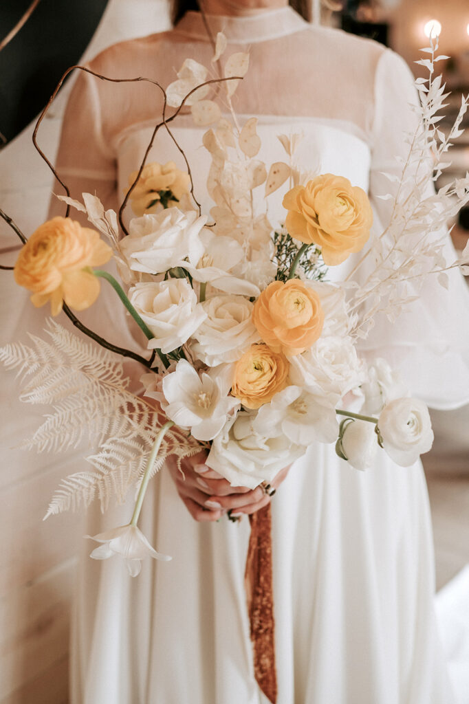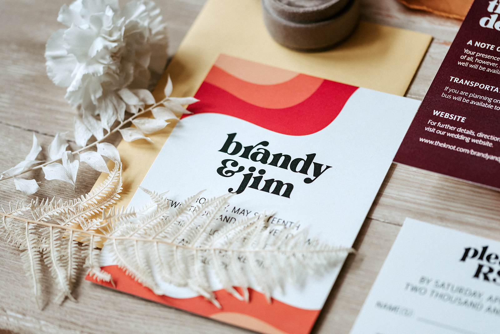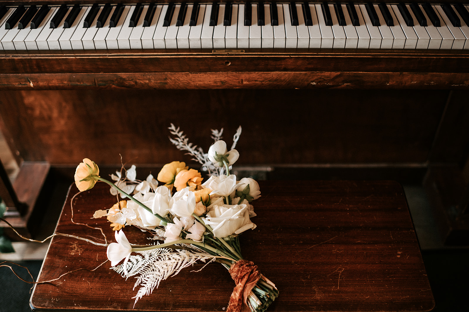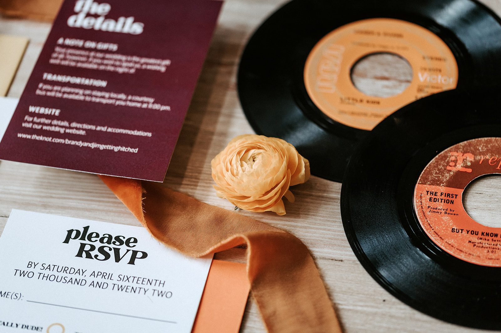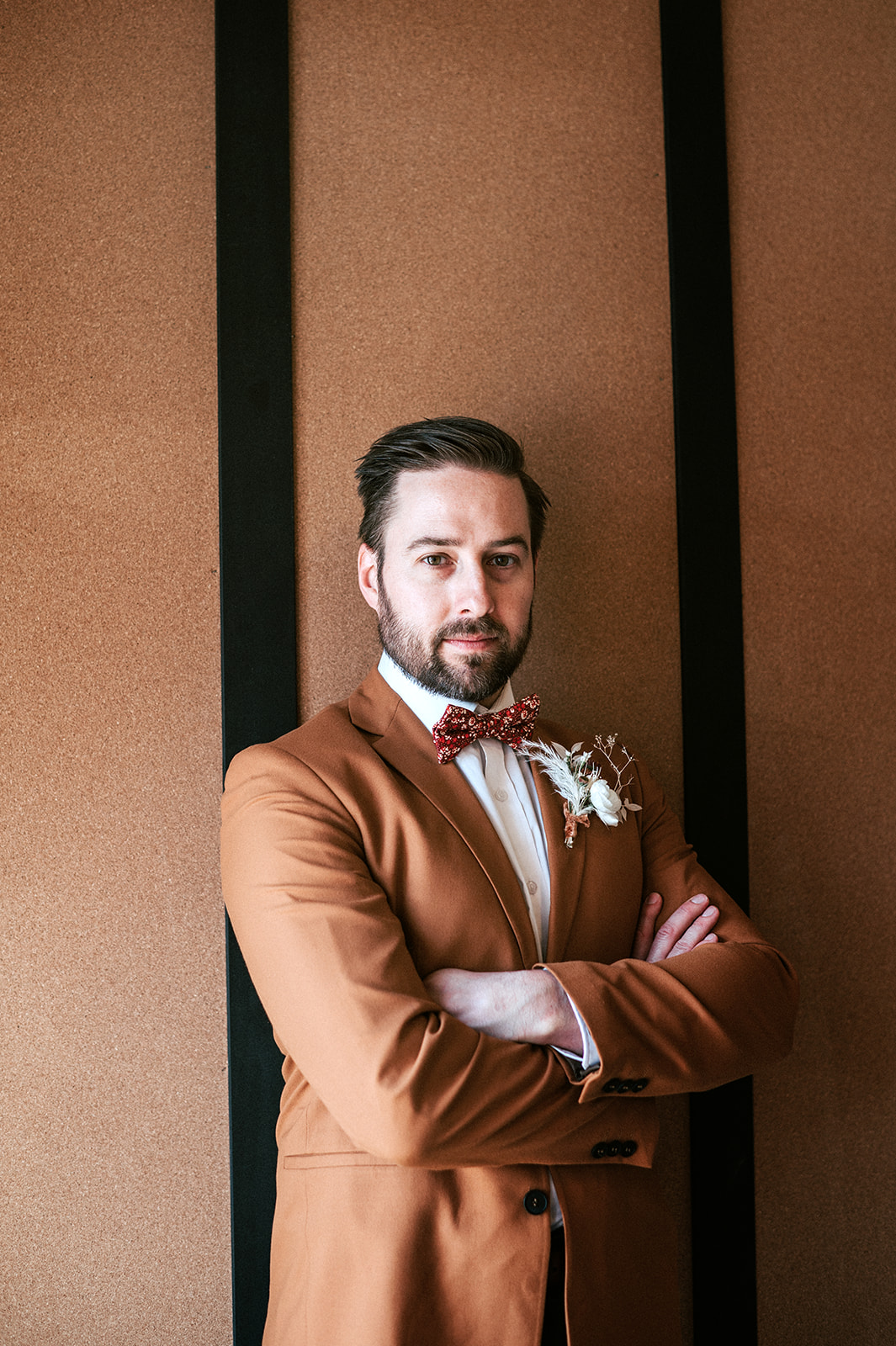 With it’s off-white crepe tiered bell sleeves and high neckline, the Sophia gown by Sistene, from Lovenote Bridal, provided just the right amount of 70 vibe. The groom wore a vibrant ochre suit jacket and a funky floral bow tie, while the bride wore clay and gold drop earrings. A triple set of stunning 70’s inspired diamond and quartz rings for our bride, and an intricate white and yellow gold wedding band for our groom added another touch of retro.