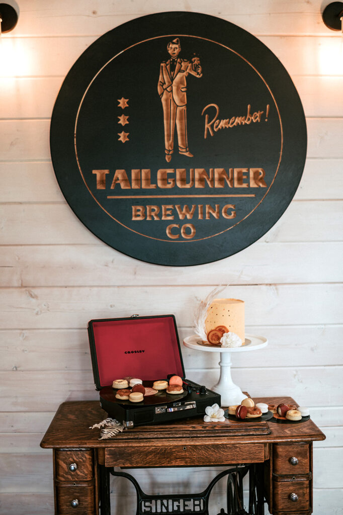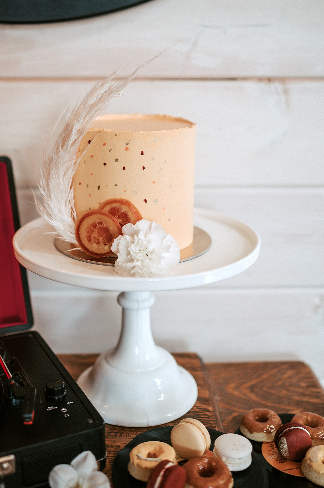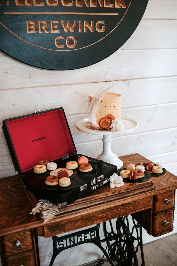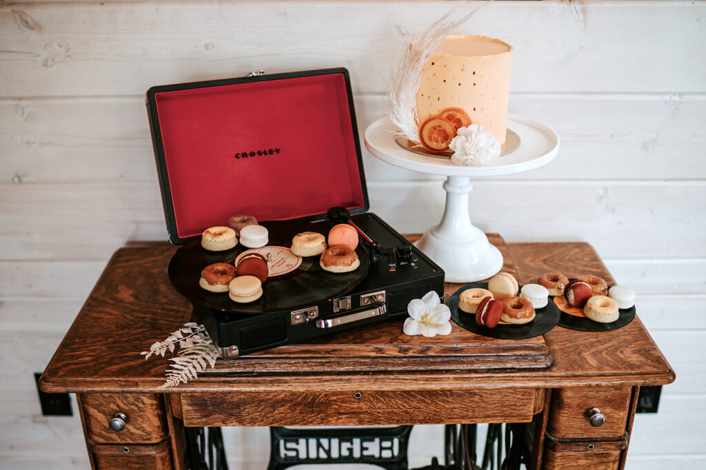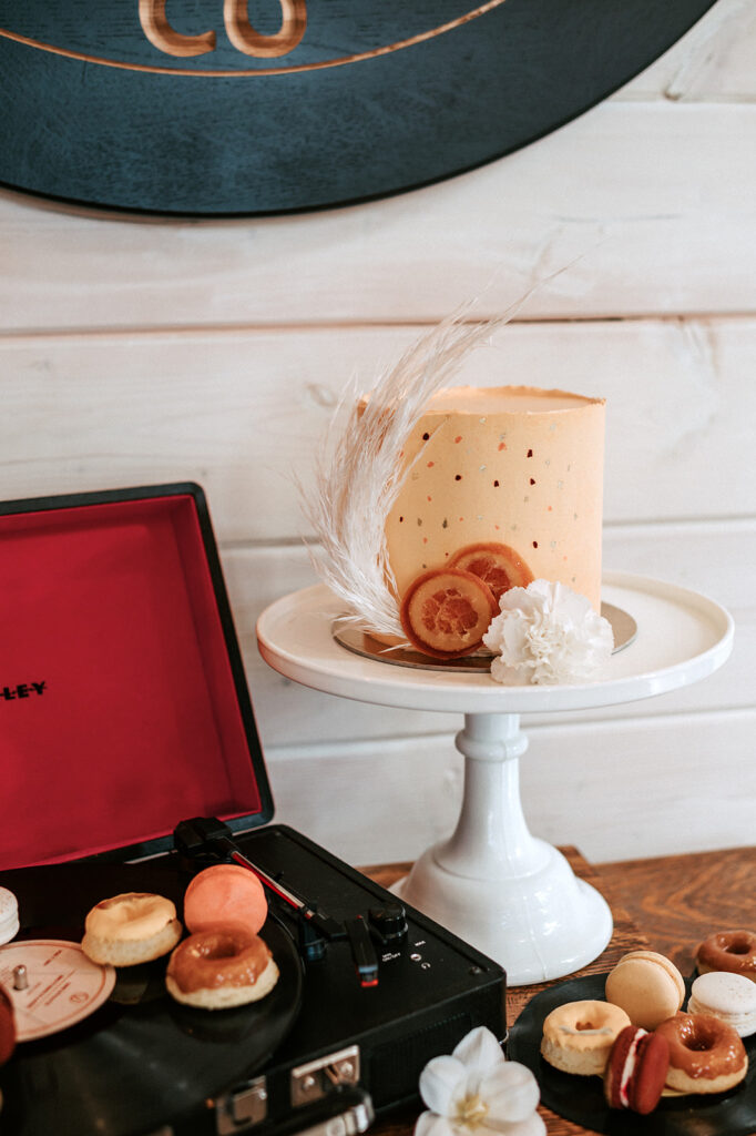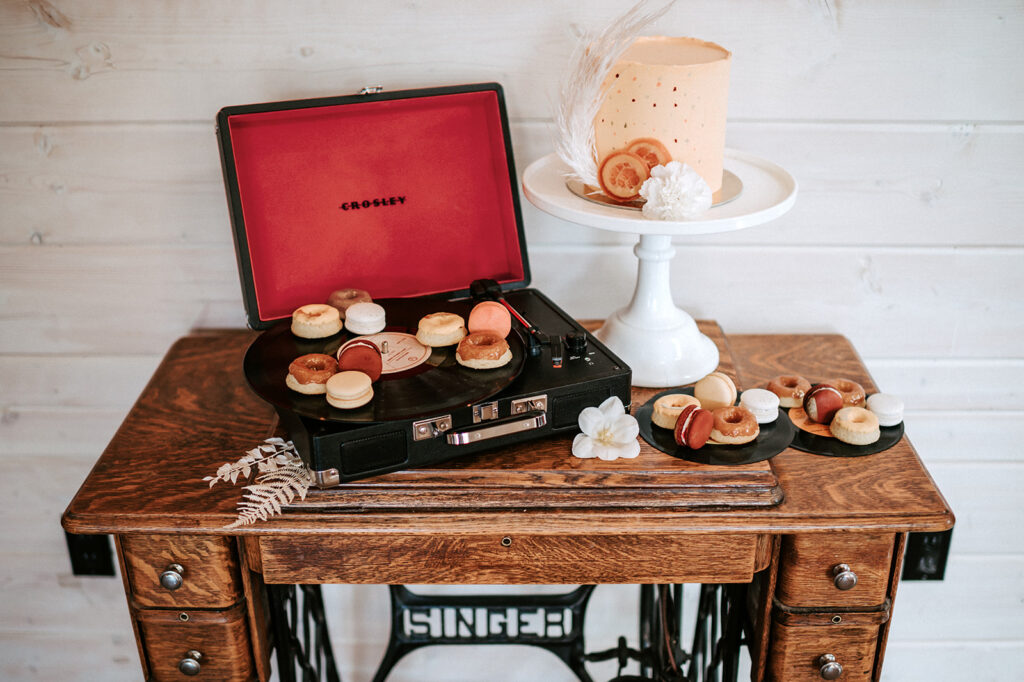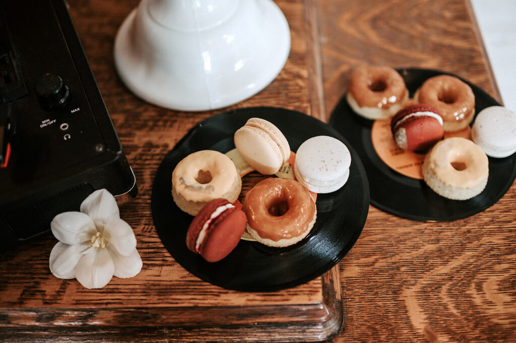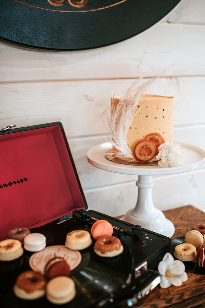 A yellow vanilla caramel cake, coupled with crème brule, raspberry, and vanilla bean macarons and passionfruit and caramel donuts were served vinyl records and a record player to provide a nod to the retro elements of the 70’s.
