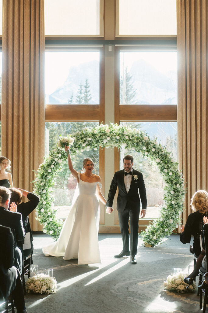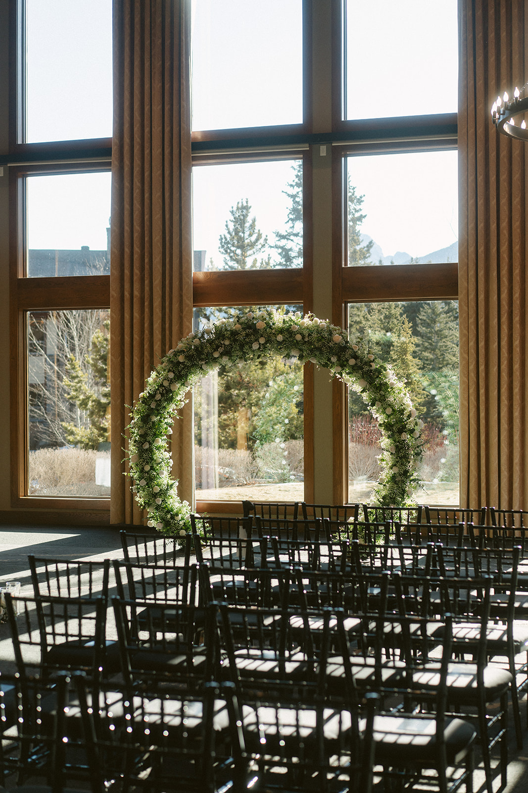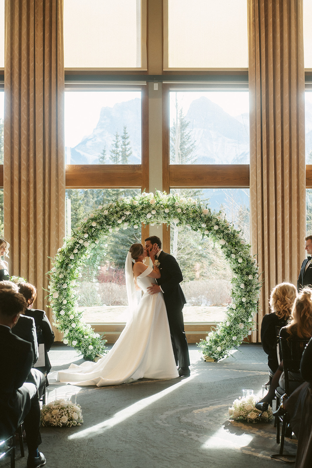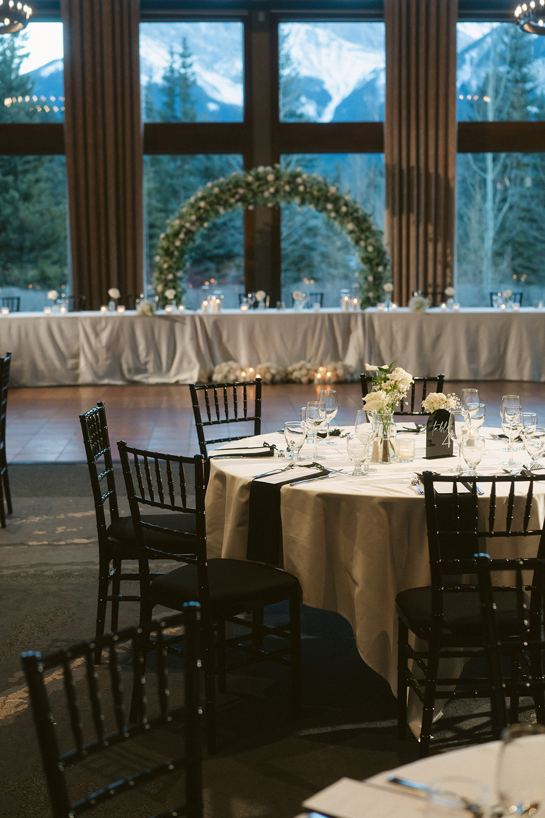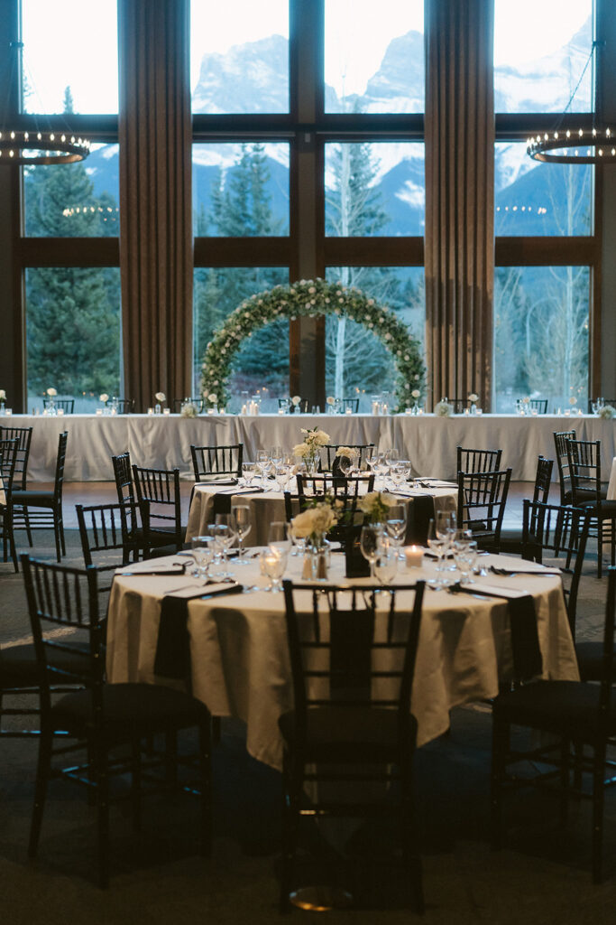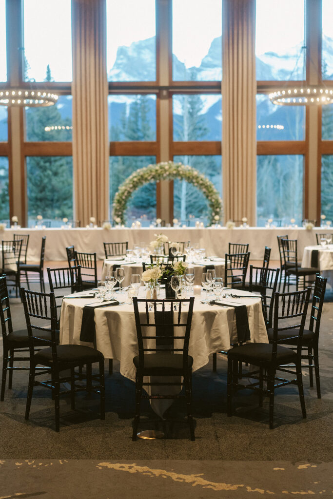 Brooke and Mike’s wedding was held with a stunning Rocky Mountain backdrop behind them, at the iconic Malcolm Hotel in Canmore. Their ceremony was filled with sunlight, and a whole lot of happy tears. Their ceremony took place beneath a romantic floral arch, with black elegant chairs setting the tone for a timeless wedding day. Their design was minimal yet elegant, and timeless with fresh greenery, ivory blooms, and touches of black and white – thoughtful details that let the beauty of Canmore shine.