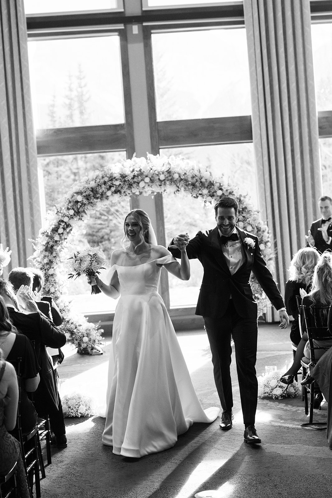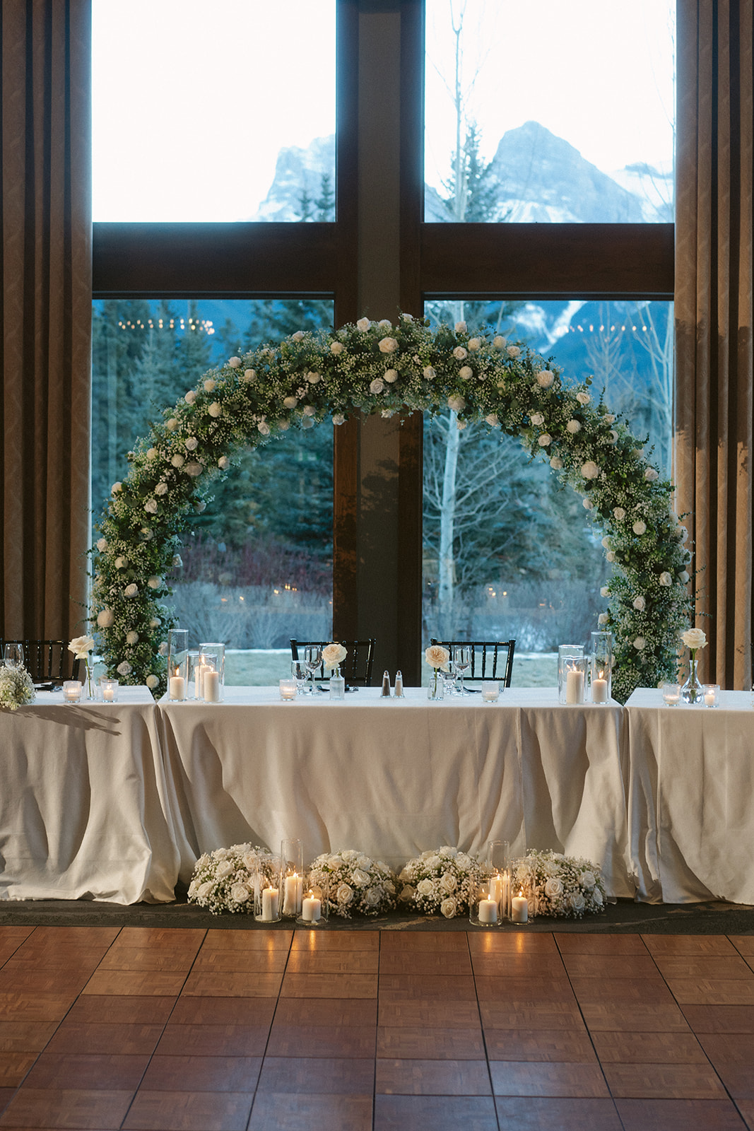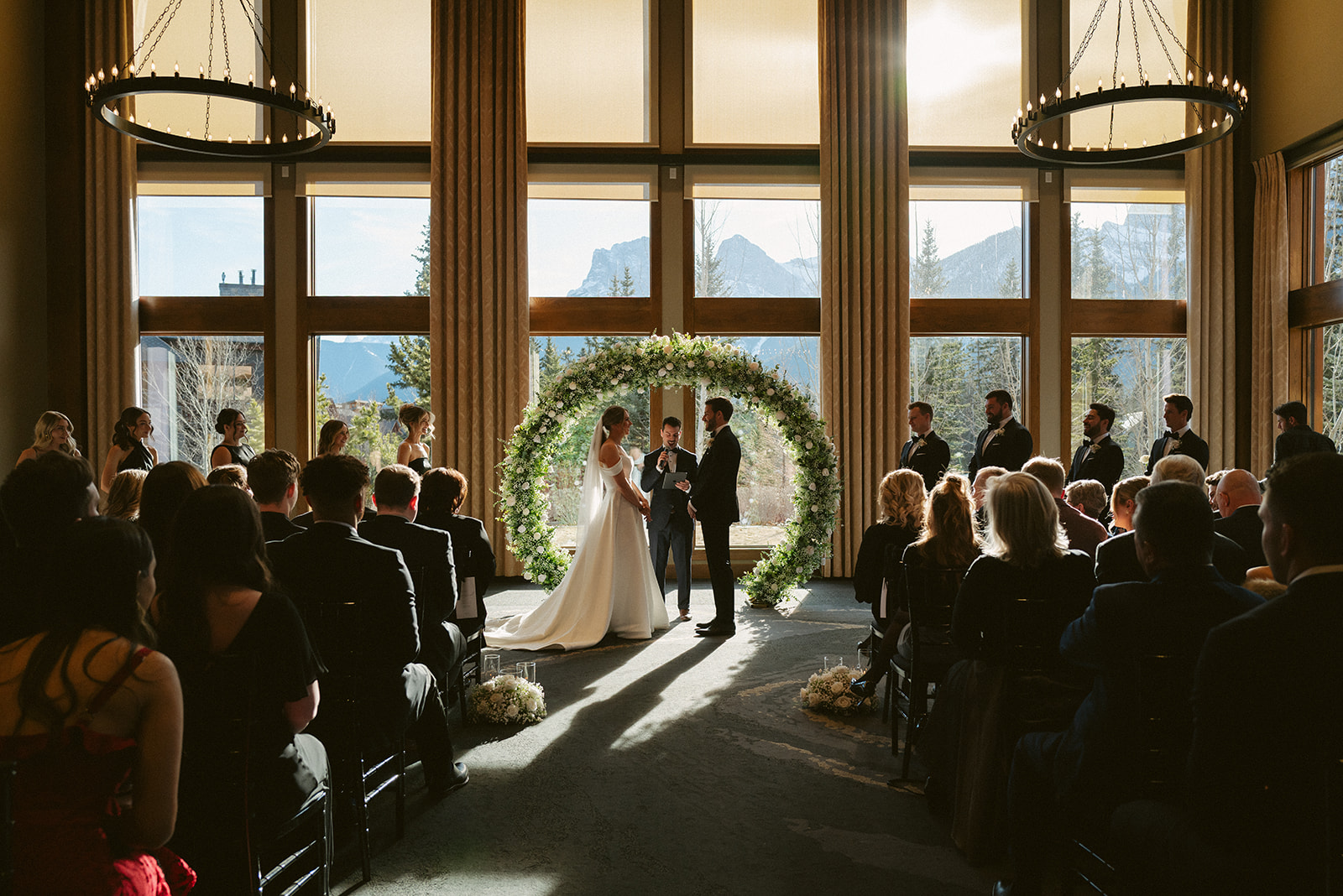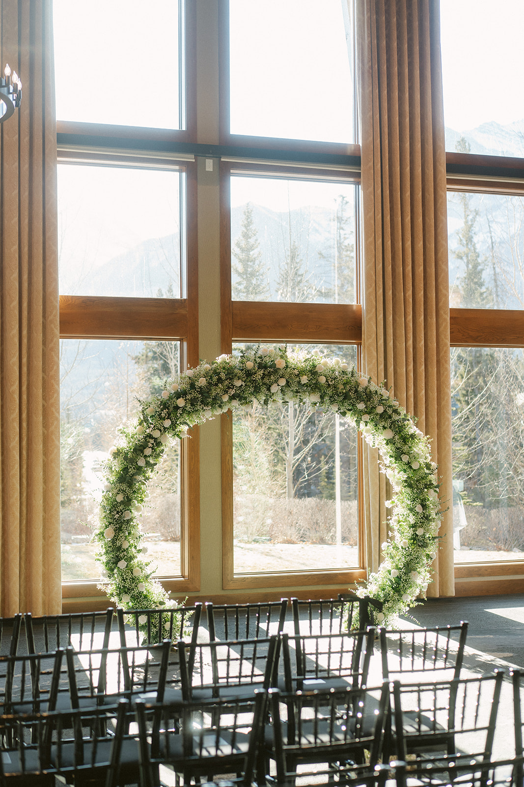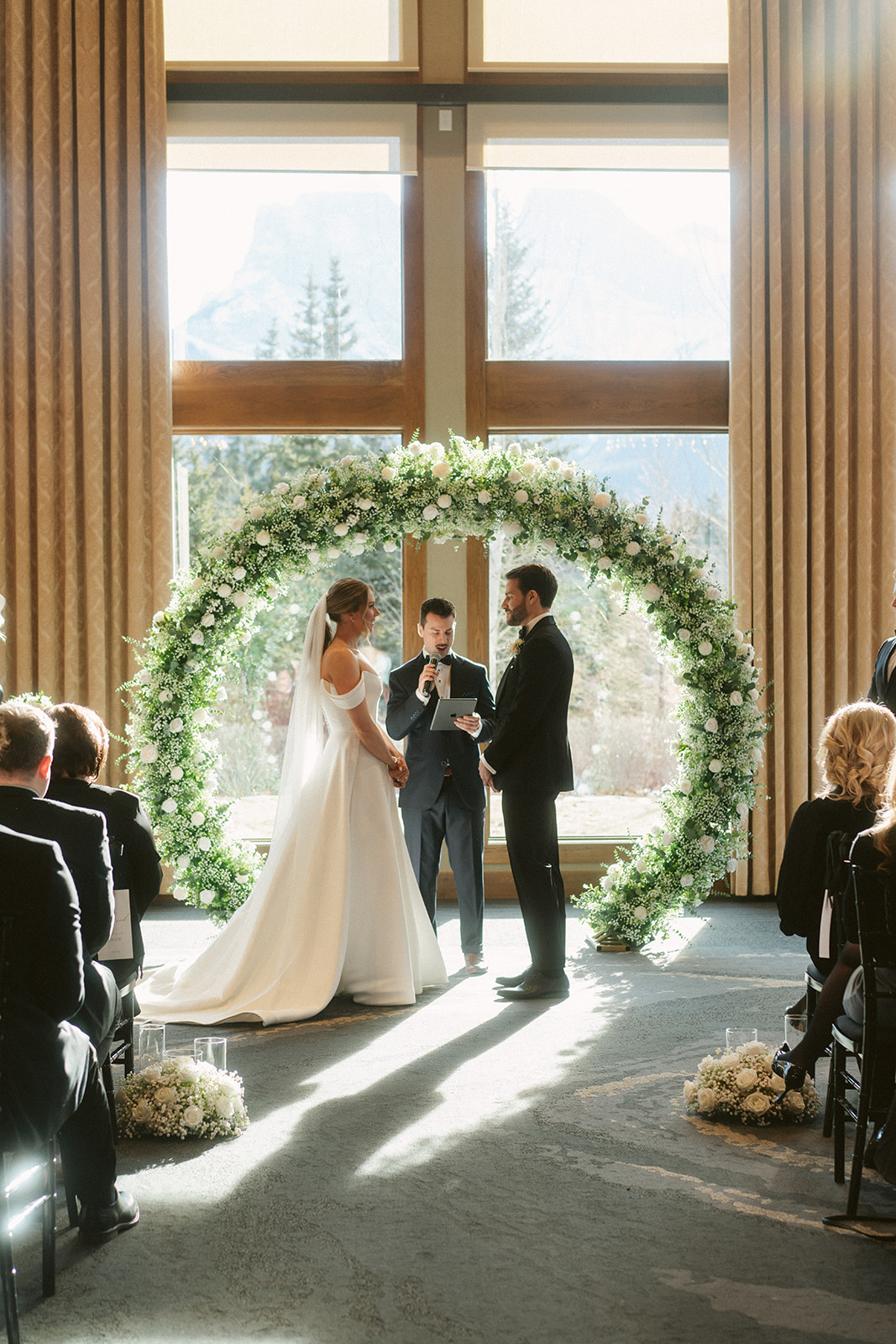 Brooke and Mike’s wedding was held with a stunning Rocky Mountain backdrop behind them, at the iconic Malcolm Hotel in Canmore. Their ceremony was filled with sunlight, and a whole lot of happy tears. Their ceremony took place beneath a romantic floral arch, with black elegant chairs setting the tone for a timeless wedding day. Their design was minimal yet elegant, and timeless with fresh greenery, ivory blooms, and touches of black and white – thoughtful details that let the beauty of Canmore shine.