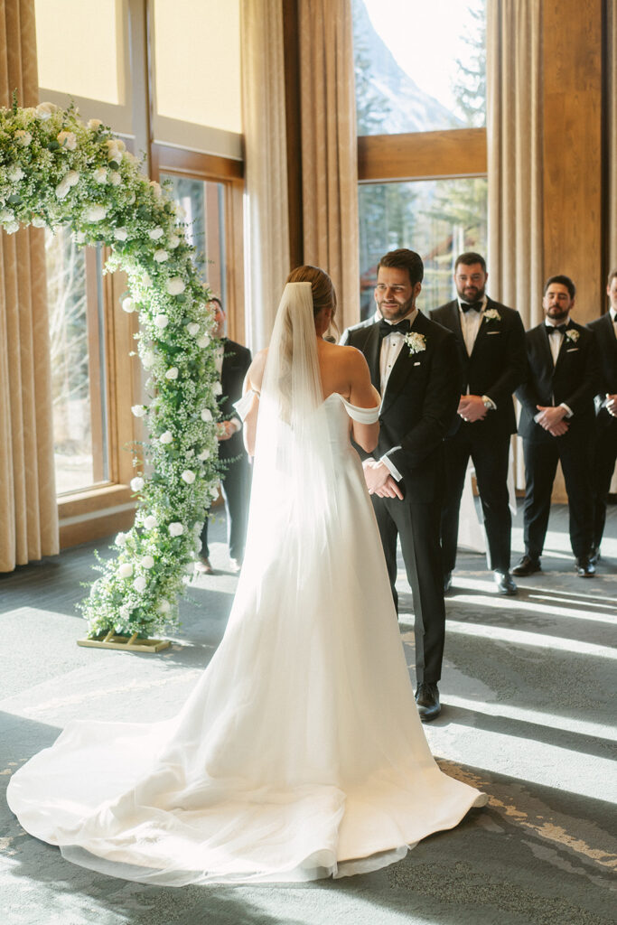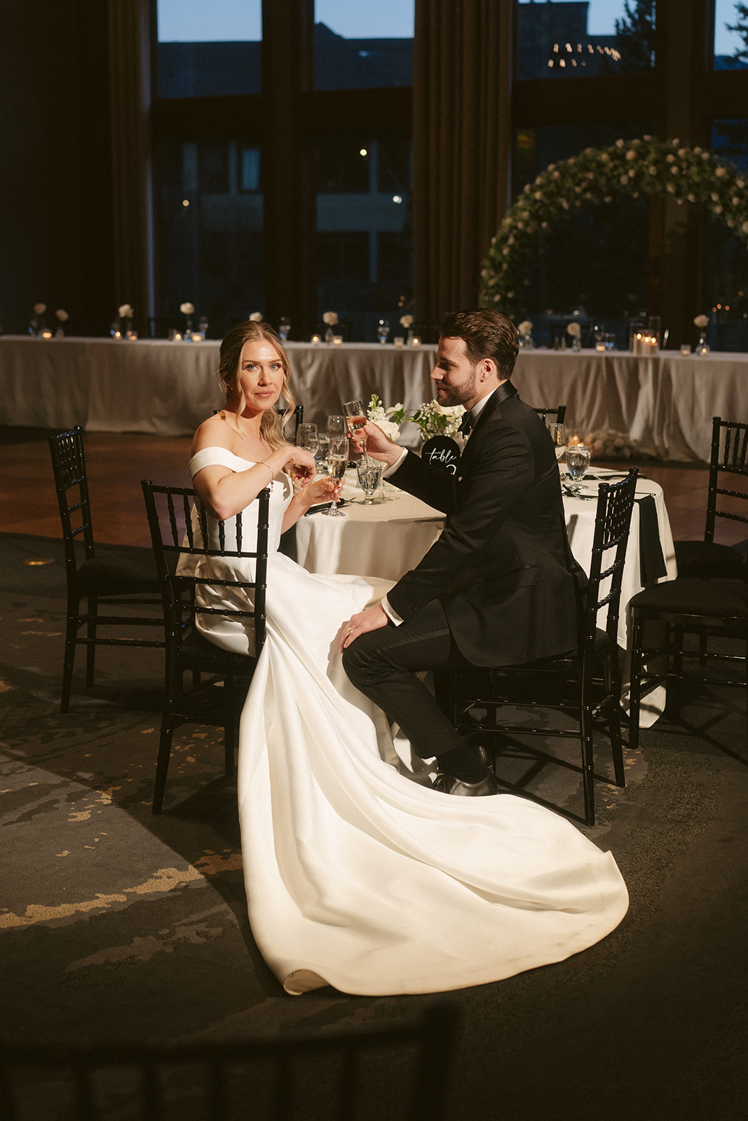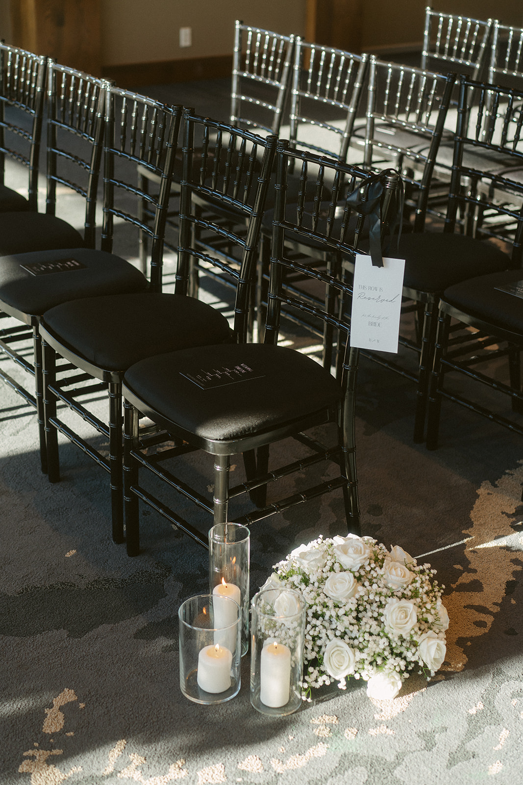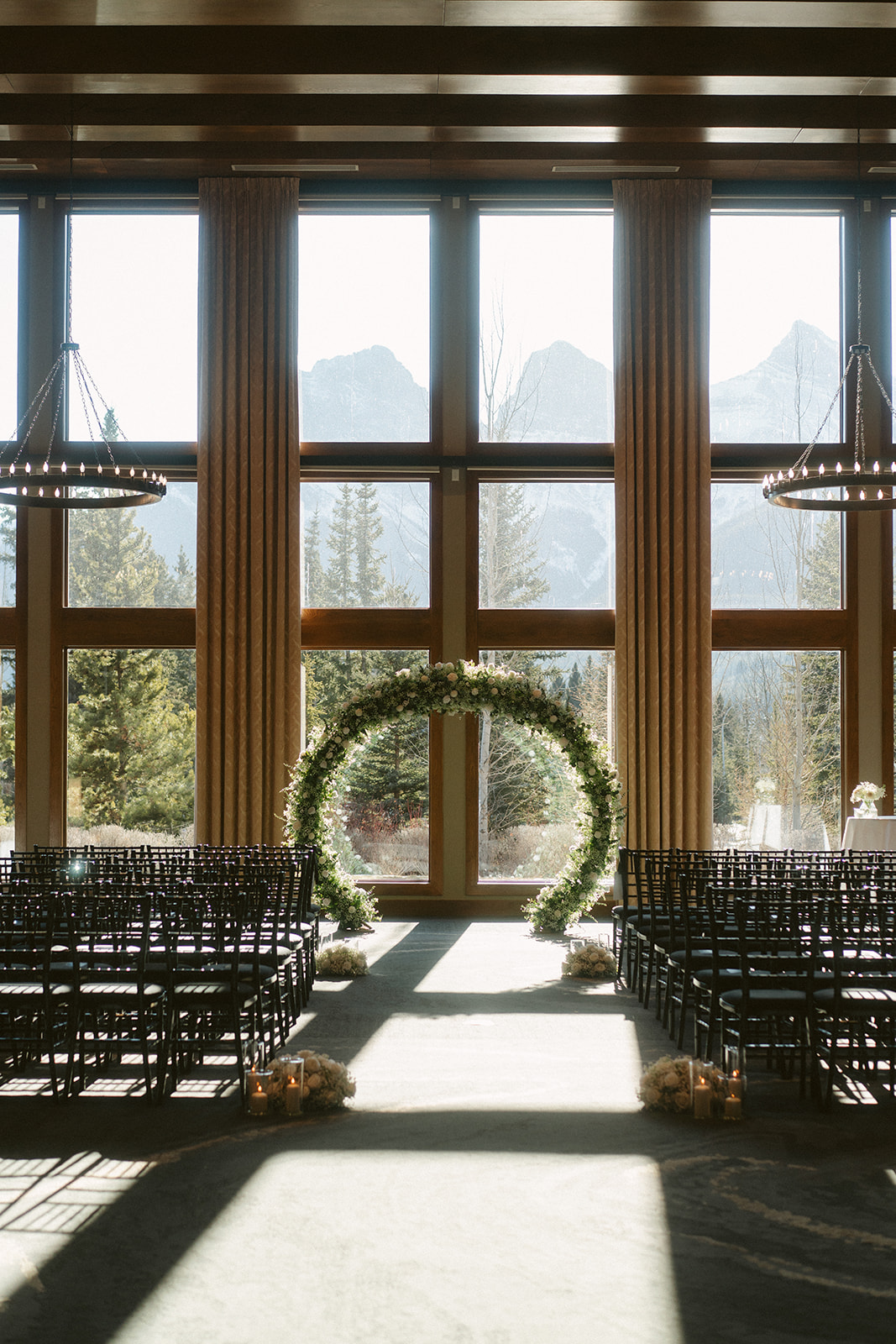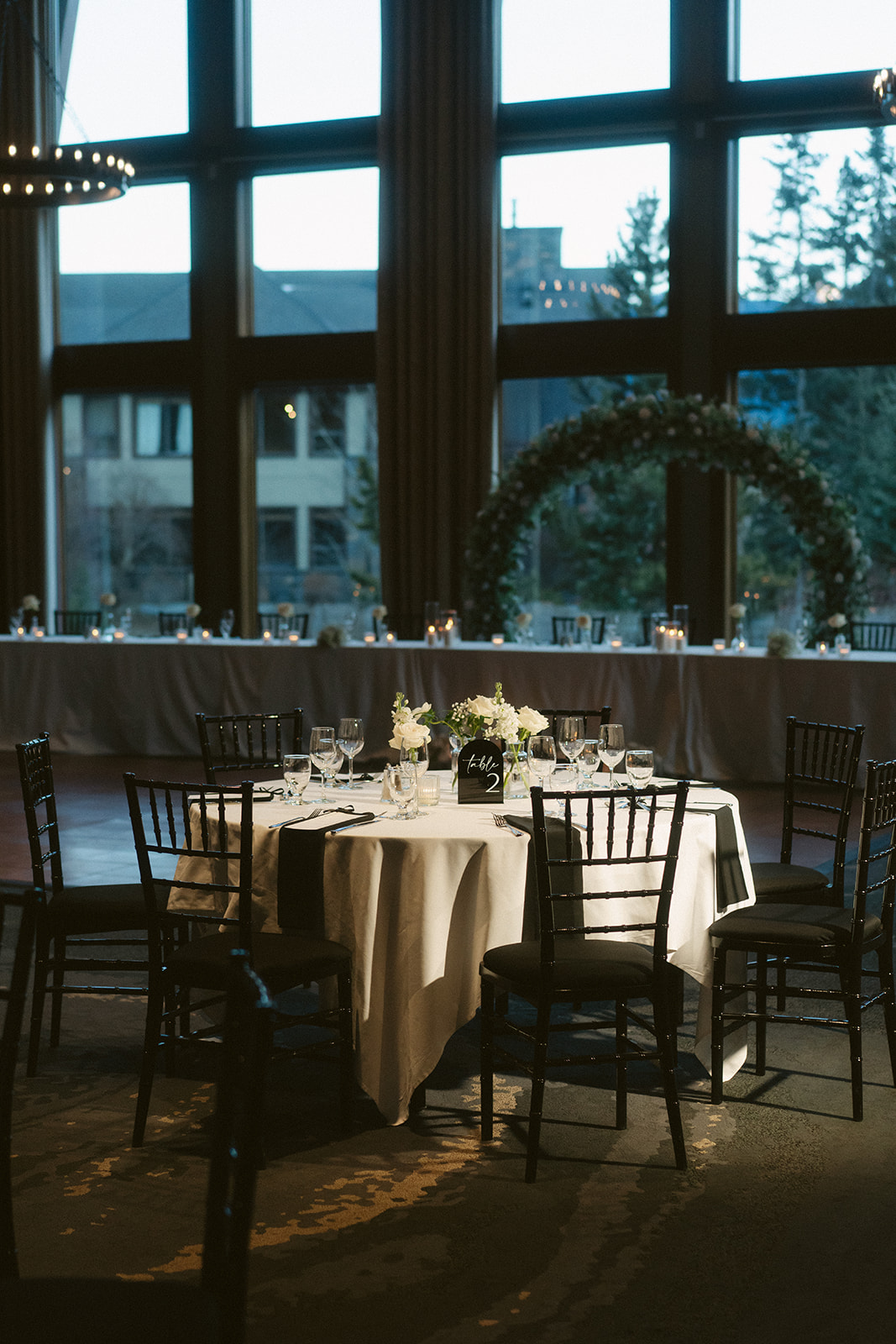 Brooke and Mike’s wedding was held with a stunning Rocky Mountain backdrop behind them, at the iconic Malcolm Hotel in Canmore. Their ceremony was filled with sunlight, and a whole lot of happy tears. Their ceremony took place beneath a romantic floral arch, with black elegant chairs setting the tone for a timeless wedding day. Their design was minimal yet elegant, and timeless with fresh greenery, ivory blooms, and touches of black and white – thoughtful details that let the beauty of Canmore shine.