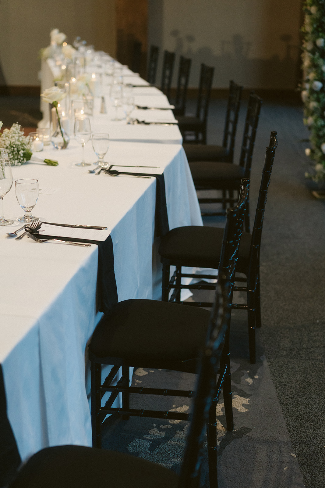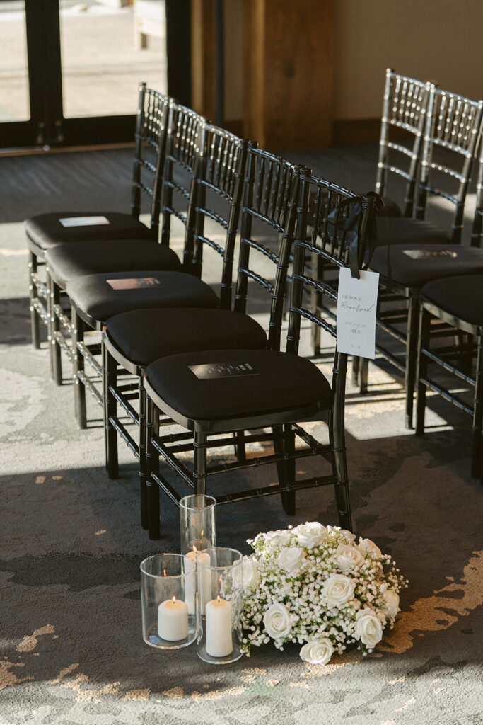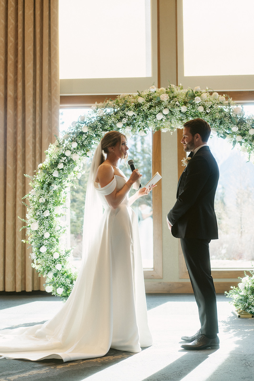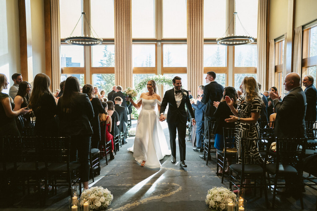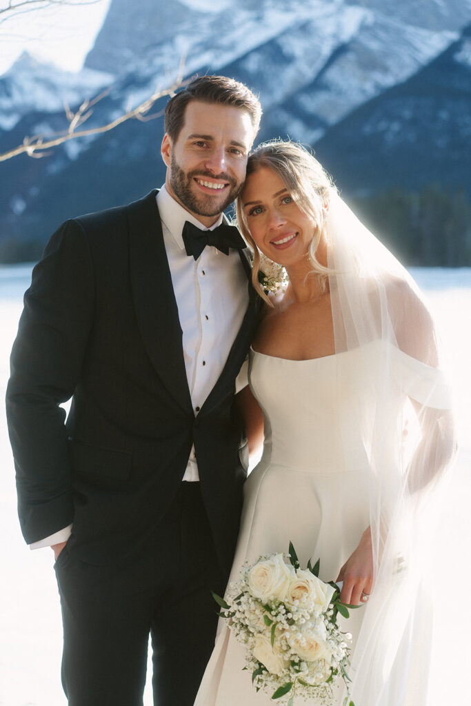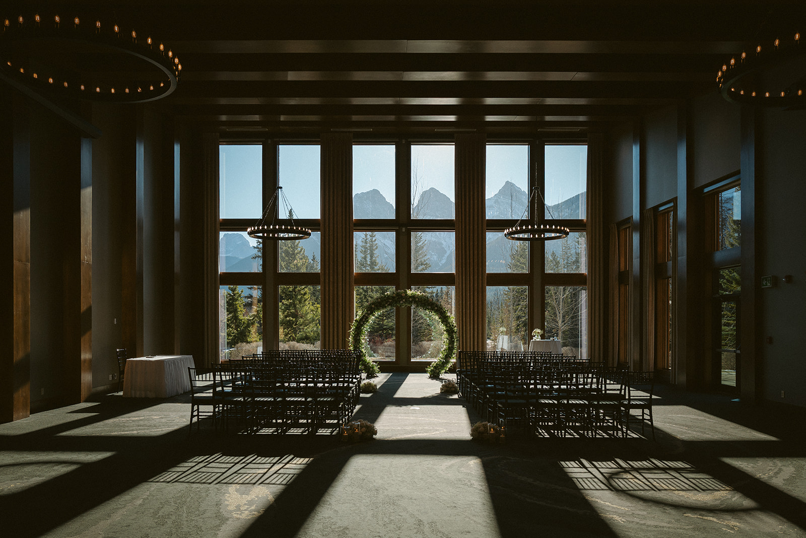 Brooke and Mike’s wedding was held with a stunning Rocky Mountain backdrop behind them, at the iconic Malcolm Hotel in Canmore. Their ceremony was filled with sunlight, and a whole lot of happy tears. Their ceremony took place beneath a romantic floral arch, with black elegant chairs setting the tone for a timeless wedding day. Their design was minimal yet elegant, and timeless with fresh greenery, ivory blooms, and touches of black and white – thoughtful details that let the beauty of Canmore shine.