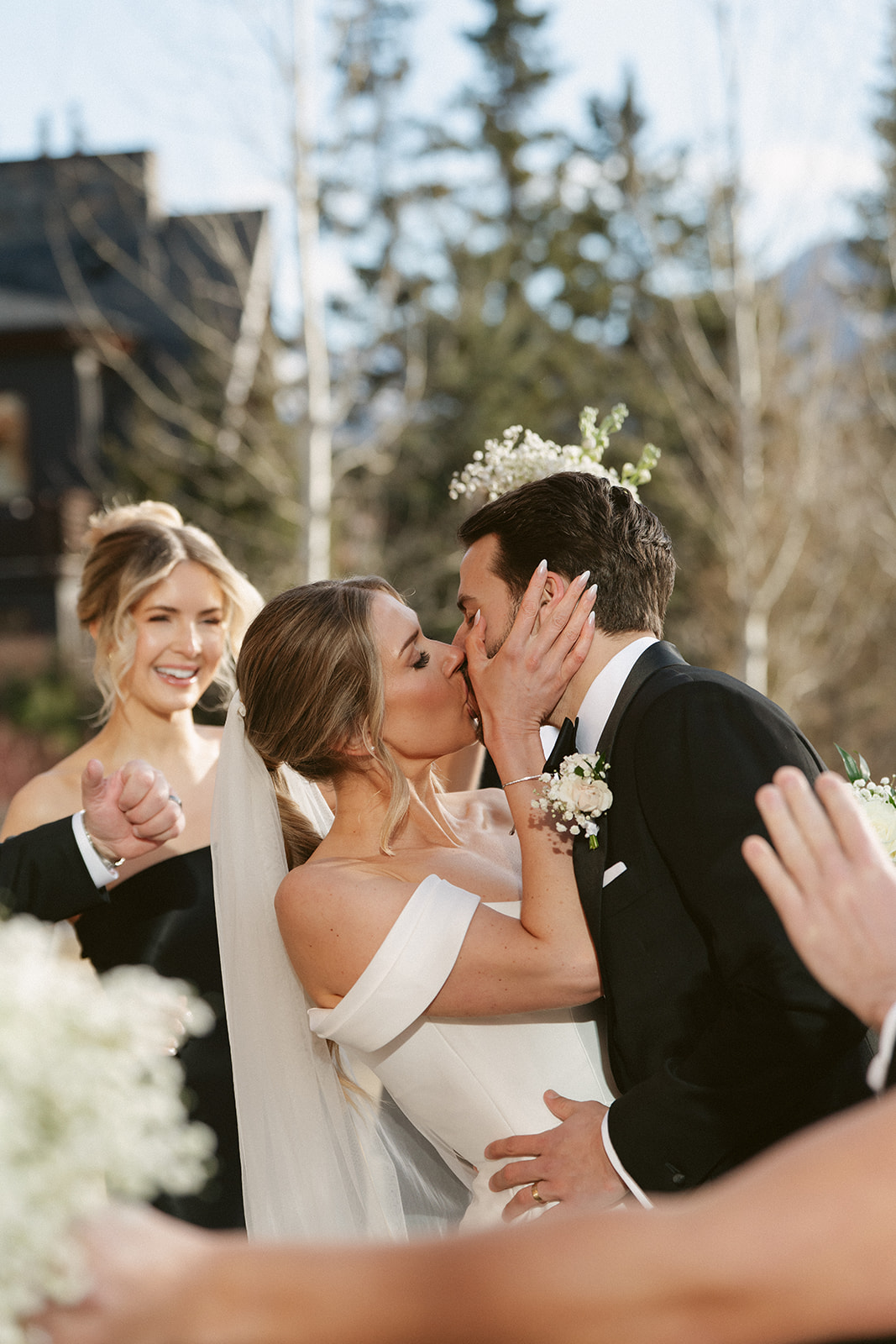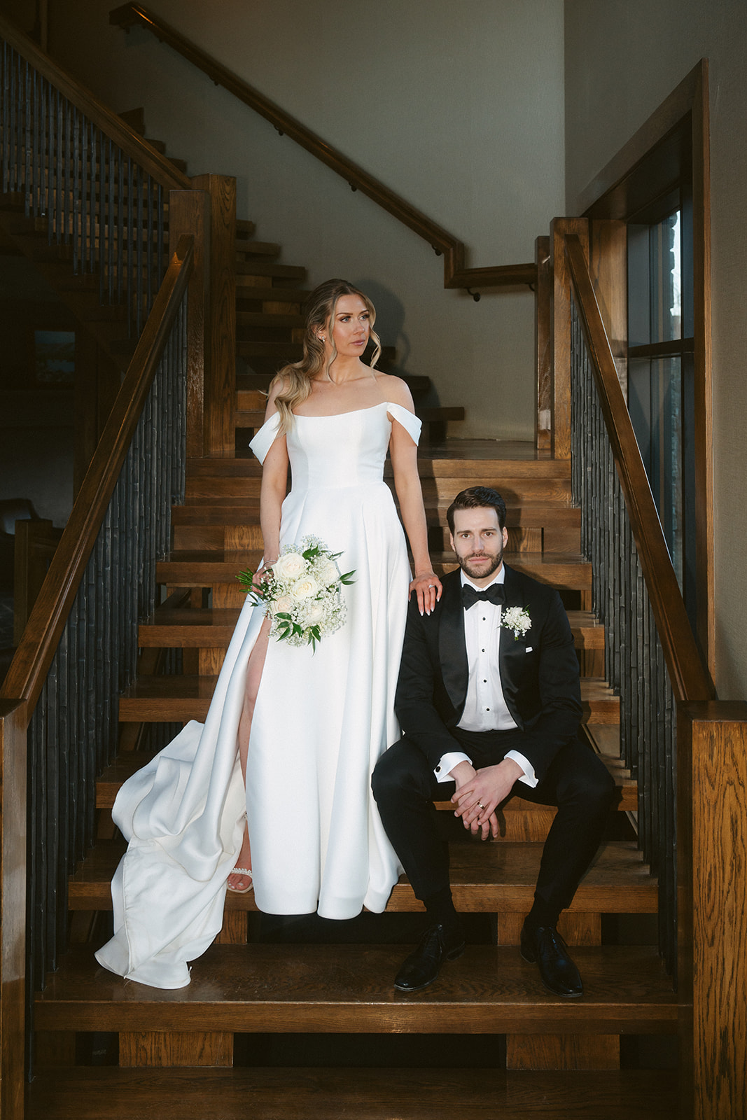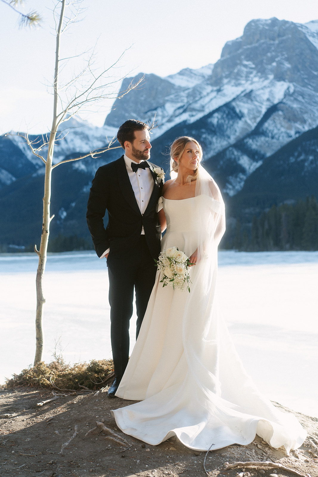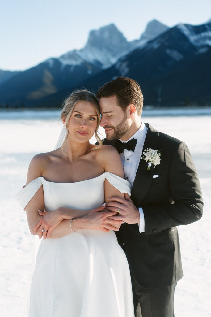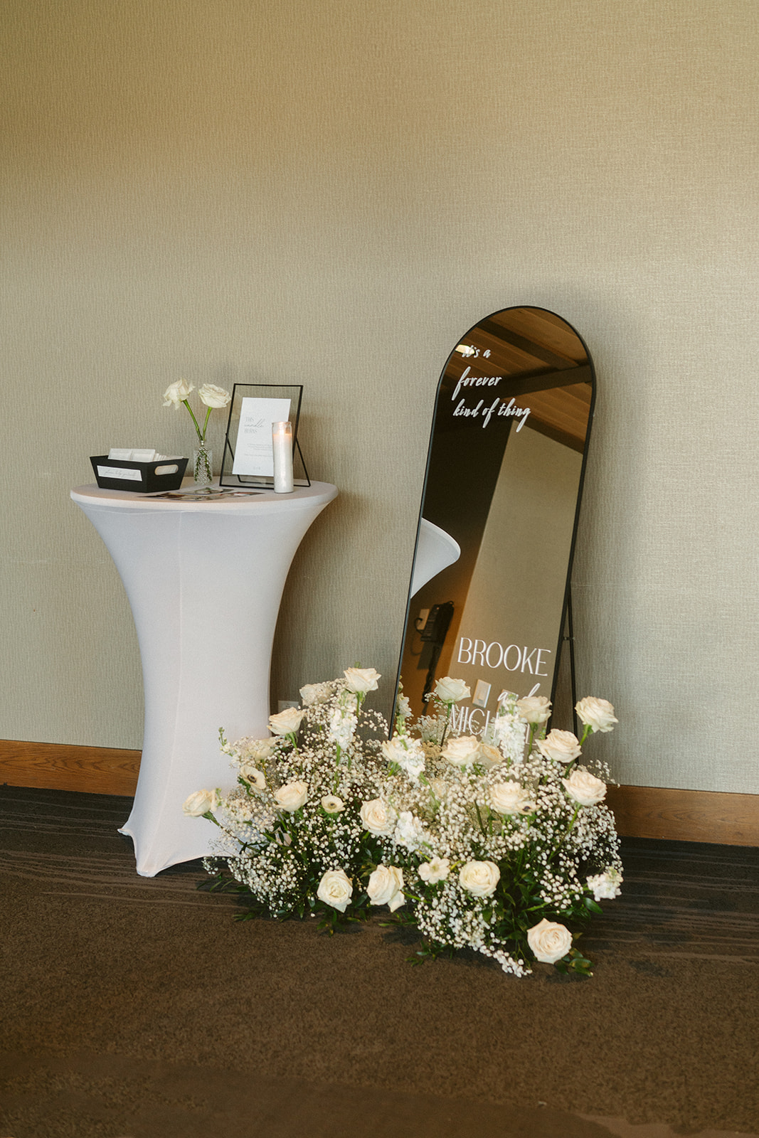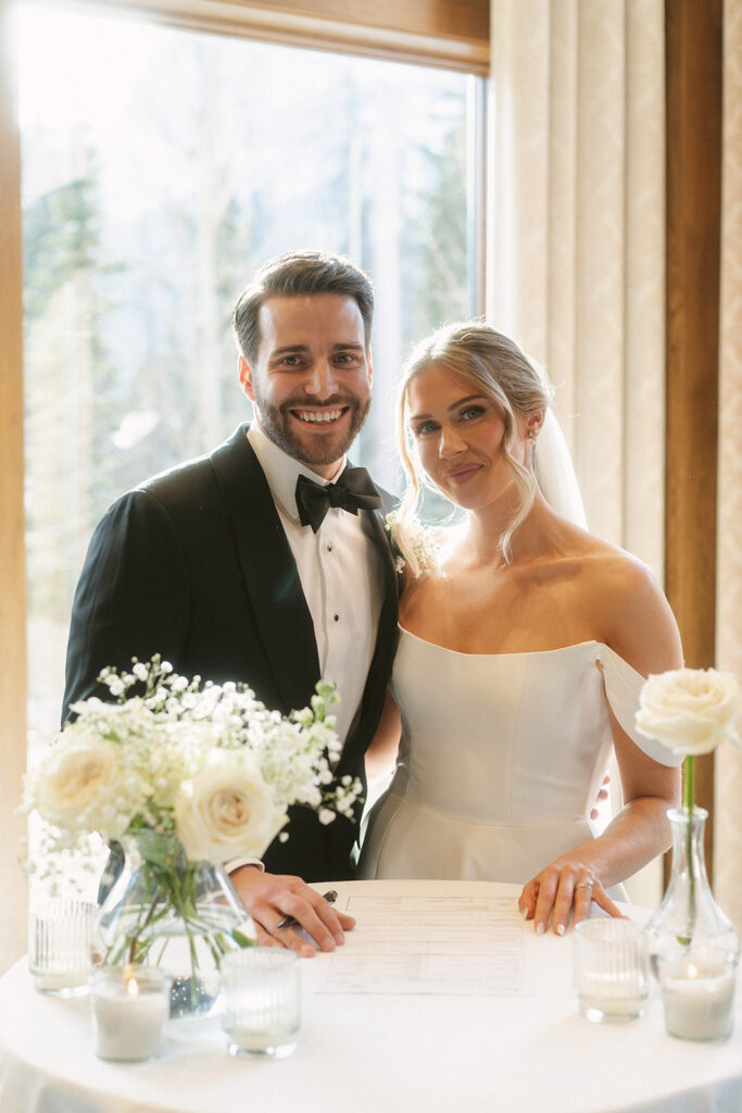 Brooke and Mike’s wedding was held with a stunning Rocky Mountain backdrop behind them, at the iconic Malcolm Hotel in Canmore. Their ceremony was filled with sunlight, and a whole lot of happy tears. Their ceremony took place beneath a romantic floral arch, with black elegant chairs setting the tone for a timeless wedding day. Their design was minimal yet elegant, and timeless with fresh greenery, ivory blooms, and touches of black and white – thoughtful details that let the beauty of Canmore shine.