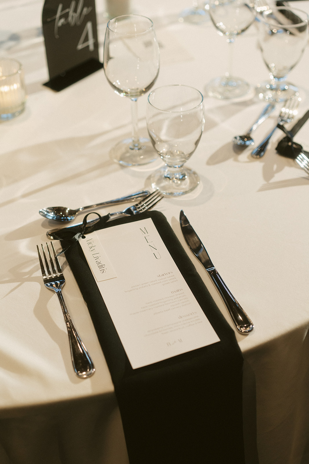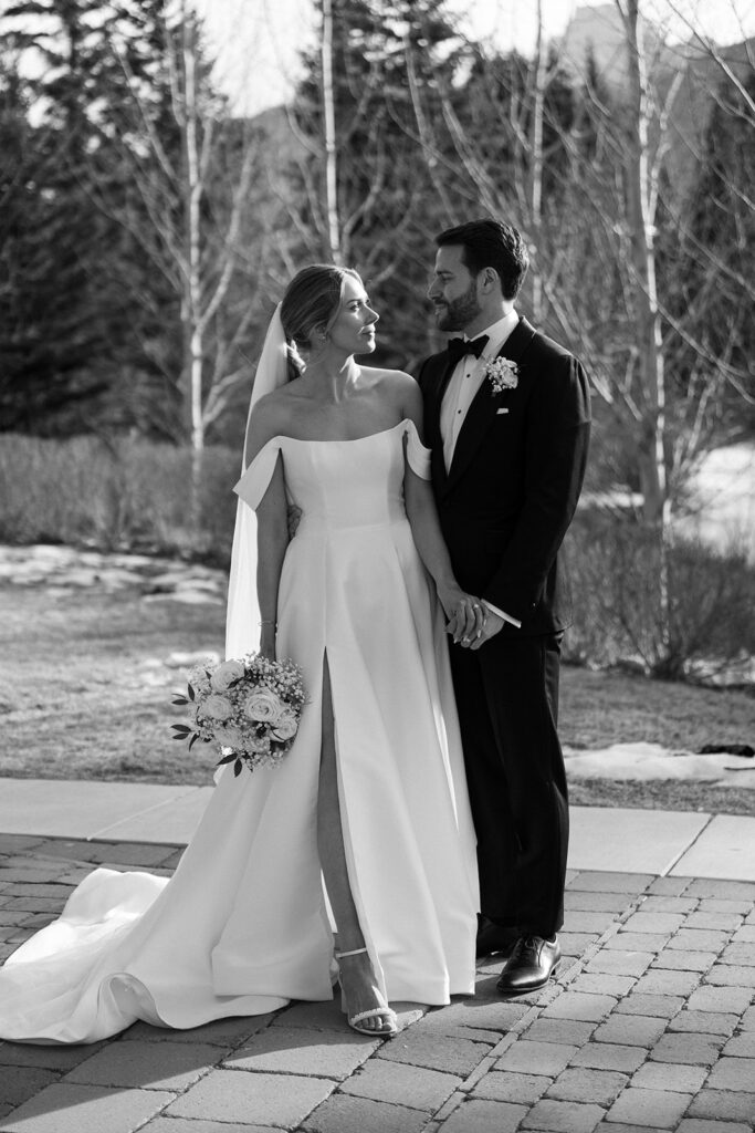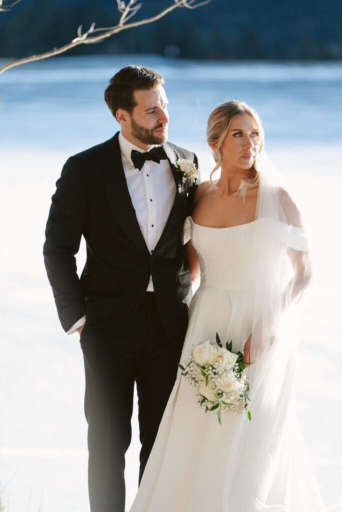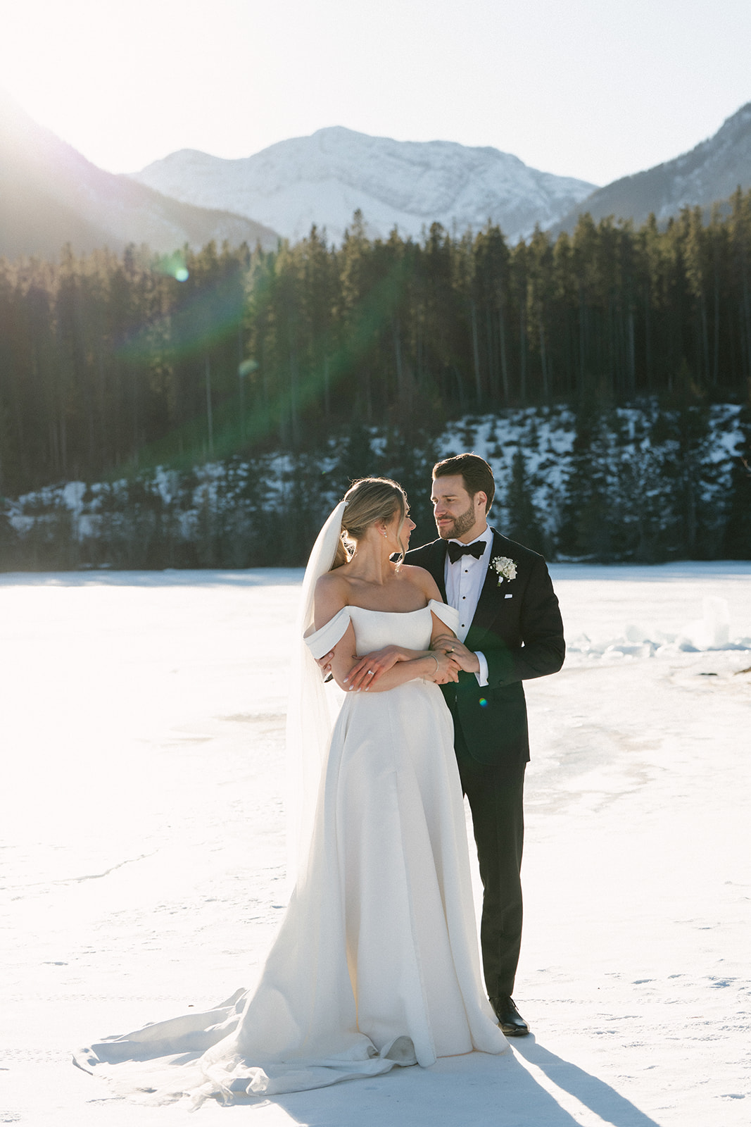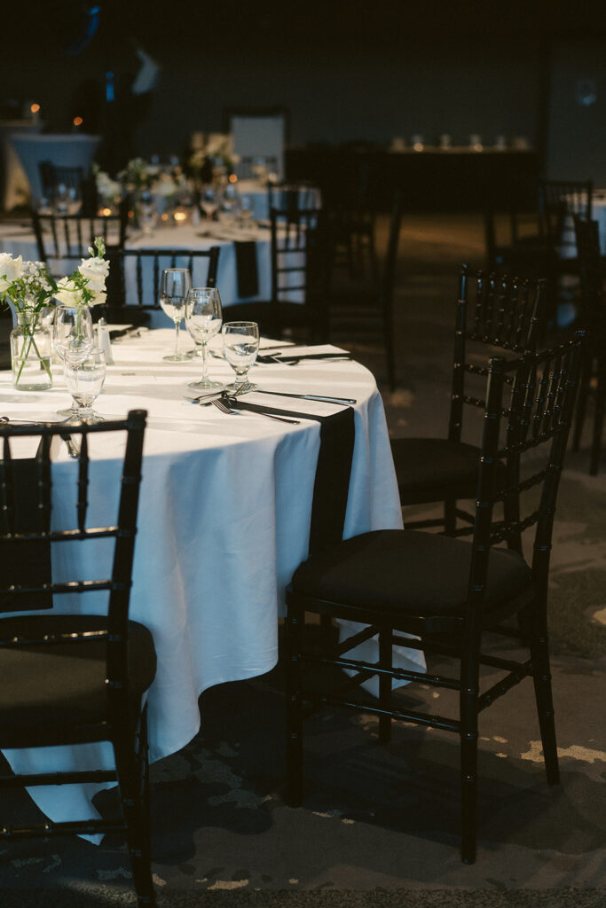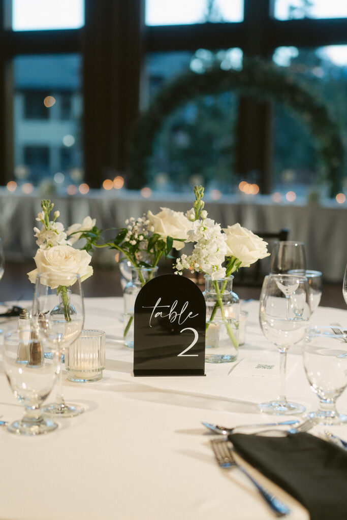 Brooke and Mike’s wedding was held with a stunning Rocky Mountain backdrop behind them, at the iconic Malcolm Hotel in Canmore. Their ceremony was filled with sunlight, and a whole lot of happy tears. Their ceremony took place beneath a romantic floral arch, with black elegant chairs setting the tone for a timeless wedding day. Their design was minimal yet elegant, and timeless with fresh greenery, ivory blooms, and touches of black and white – thoughtful details that let the beauty of Canmore shine.